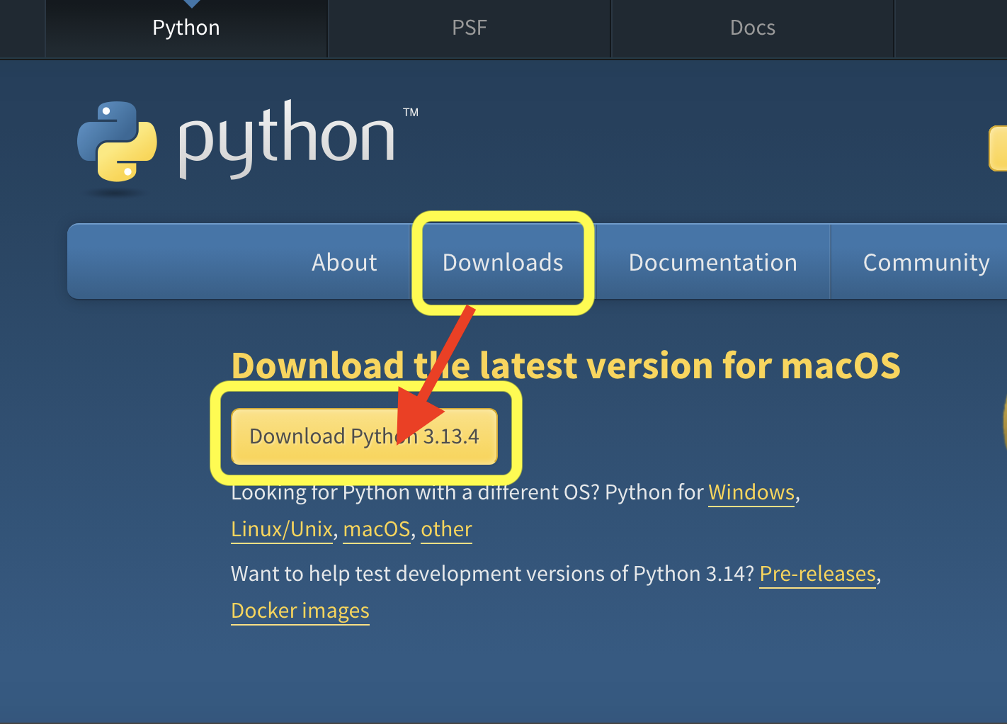 • Windows 사용자: Download Python X.X.X 버튼 (X.X.X는 최신 버전 숫자)을 클릭합니다.