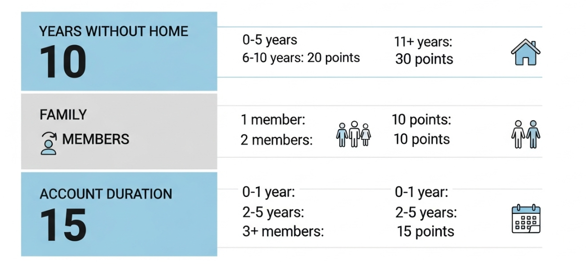 👉 예를 들어, 무주택 10년(20점), 부양가족 3명(15점), 가입기간 10년(10점)이라면 총 45점입니다.
