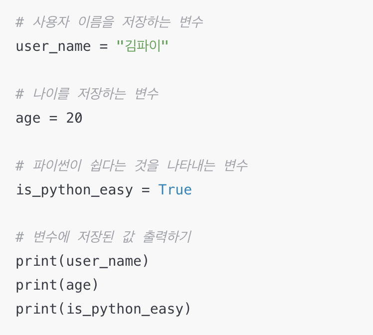 - 예약어(Keyword) 사용 금지: if, for, while, print 등 파이썬에서 이미 특별한 의미를 가지는 단어(예약어)는 변수 이름으로 사용할 수 없습니다.